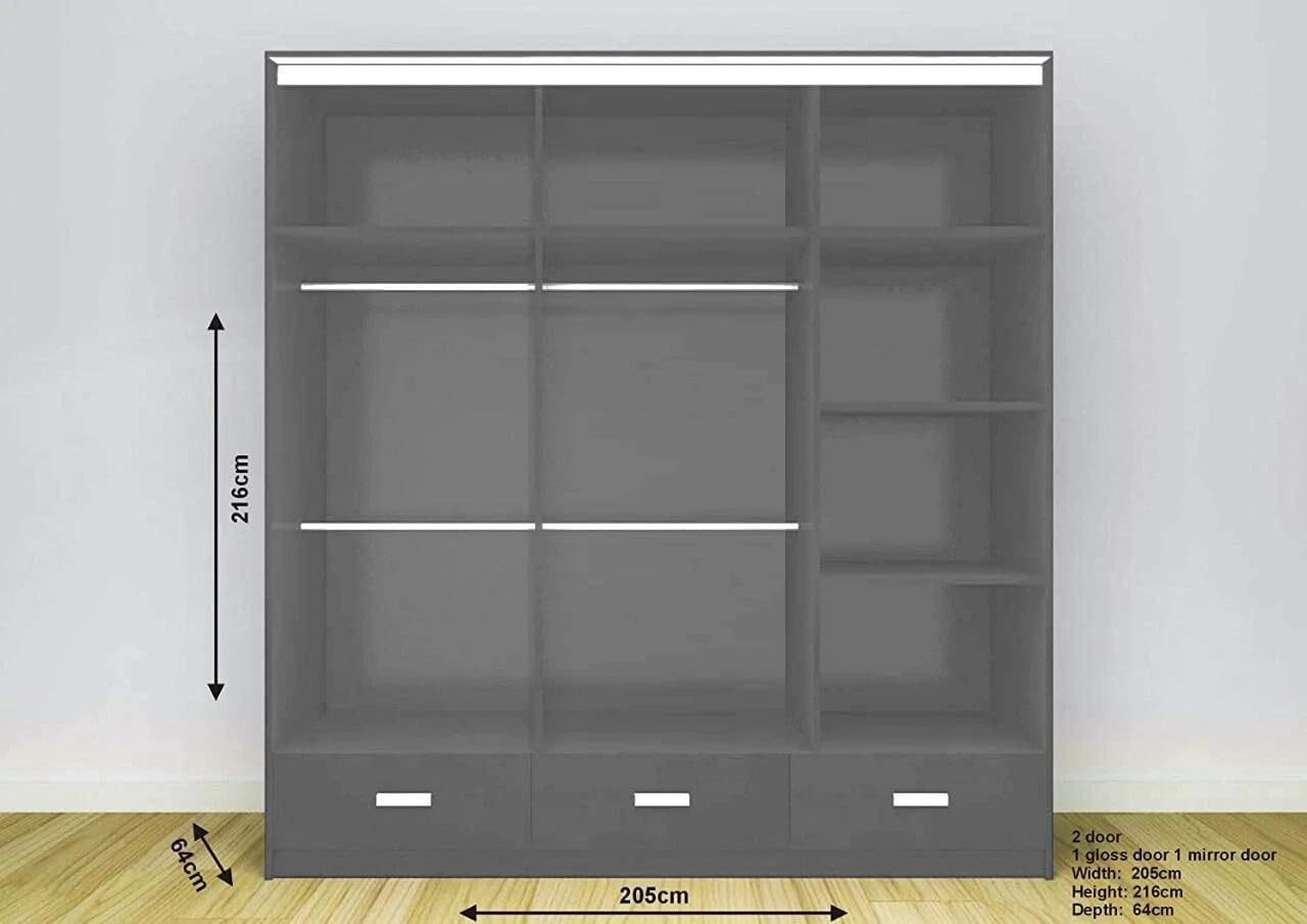 Product description Features: New High gloss front with draws and matt finish on the side, comes with long led light including the price. Chrome handles on the doors and drawers. Sliding Door Wardrobe comes with giving your bedroom a classy look! With both hanging space and shelf storage. Dimensions: Width: 205cm Height: 216cm Depth: 66cm Dimensions: Width: 254cm Height: 216cm Depth: 66cm Wardrobe 2 Sliding Doors 205cm includes: 6 shelves 2 drawers, 4 hanging rails LED light. Wardrobe 3 Sliding Doors 256cm includes: 7 shelves, 3 drawers, 4 hanging rails. LED light Safety Warning Always assemble and secure the cabinet properly to prevent tipping. Be cautious of slippery surfaces when the cabinet is wet. Keep the lockable doors within reach of children and pets to prevent accidental trapping. Legal Disclaimer Return Time Period:- 1- We provide a 30 days return period but buyer must pay the return postage. 2- Any damages please notify within 72 hours as our courier company does not accept any damages after that time period. 3- All returned items should be in the original packaging. We do not accept any return if the item has been installed. 4- Customer is fully liable for ordering a wrong size wardrobe.